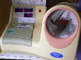 血圧計を設置しております。来院して少し時間をおいて、深く腰掛け、できるだけ姿勢を正した状態で計測してください。(前かがみにて測ると血圧がやや高く出ます)